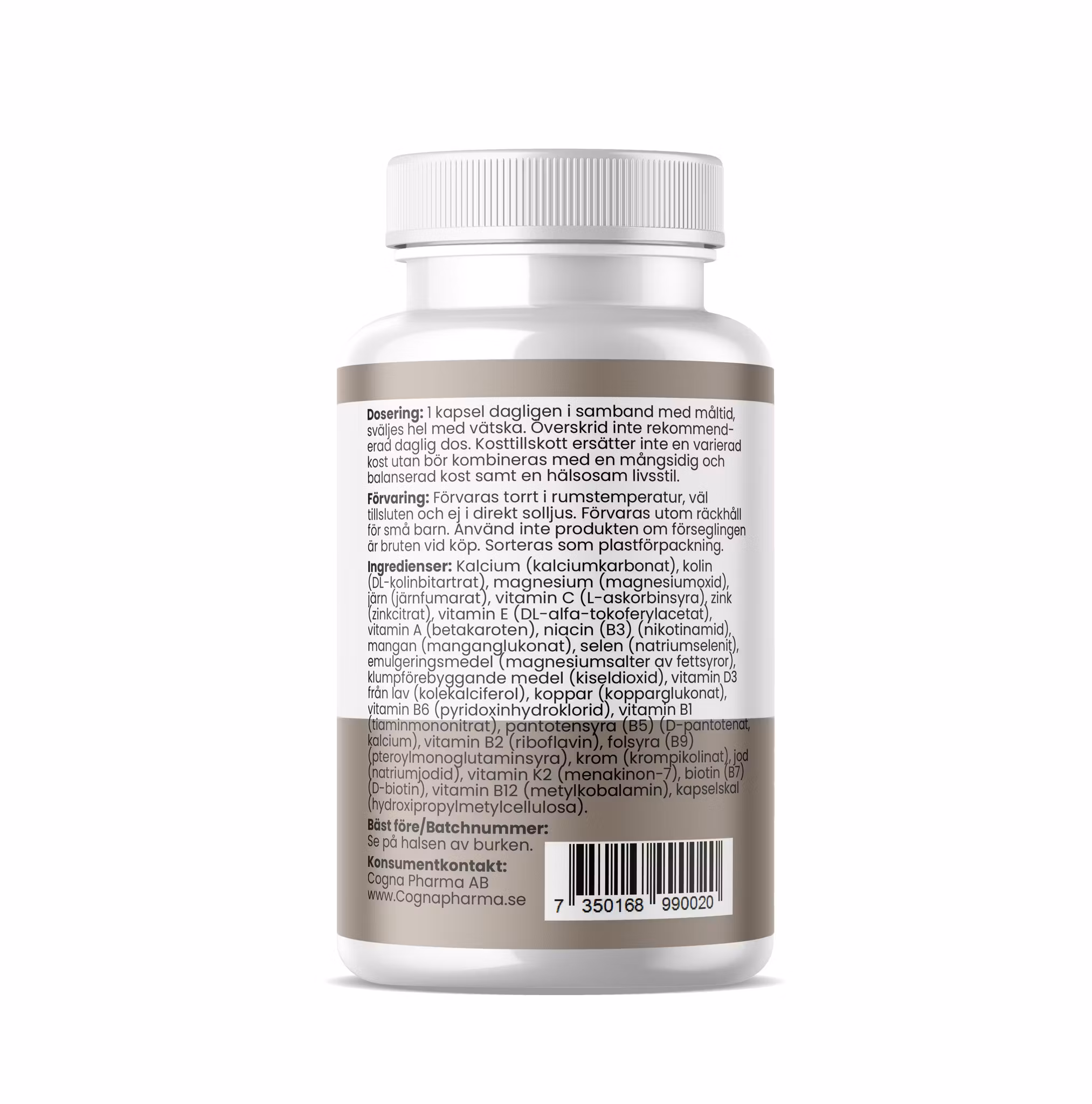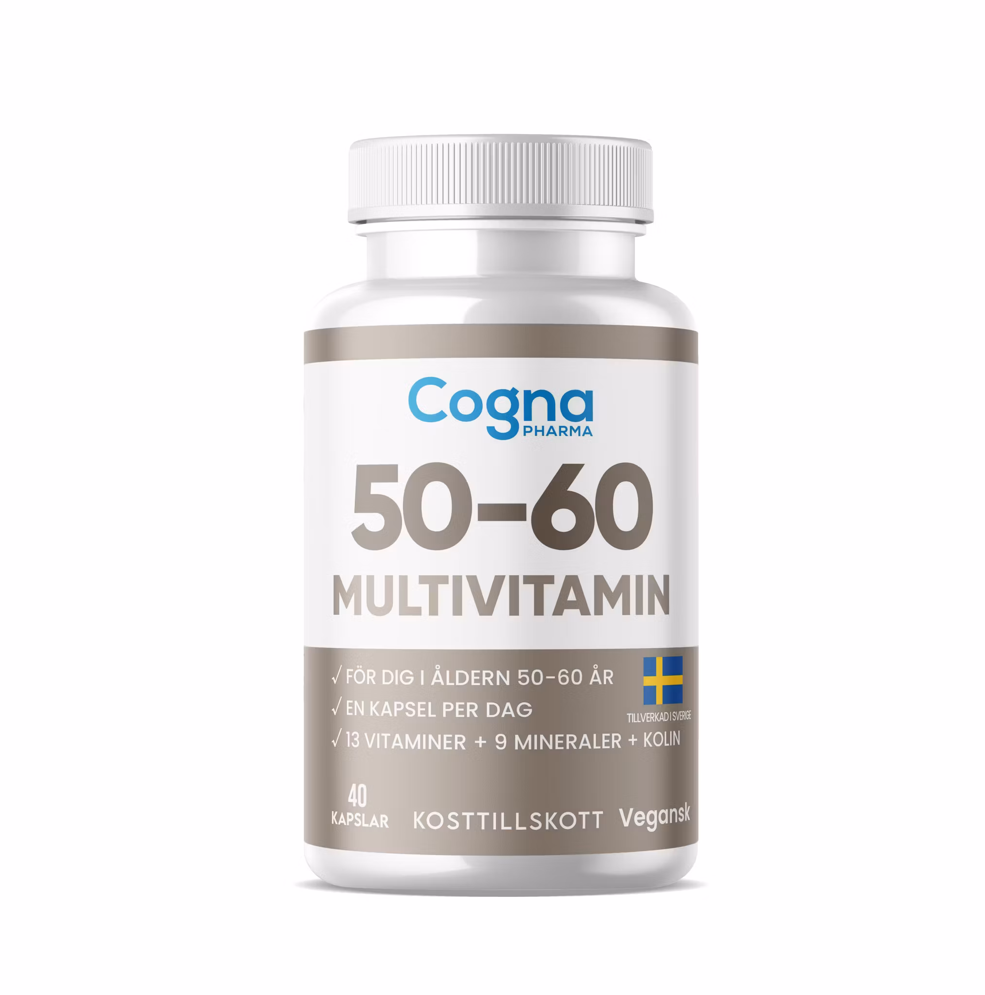 Svensktillverkad vegansk multivitamin, framtagen för dig i åldern 50–60 år. Extra D-vitamin, vitamin B6, Krom och Koppar. Berikad med kolin som har vitaminliknande egenskaper som hjälper till med fettomsättningen och stödjer leverns normala funktion.